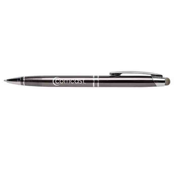 Durable metal protects the ink cartridge from damage caused by frequent drops from office desks and tables. The metal construction of the Hub Pens Grey Smoothscript Stylus pen also generates a sleek appearance that will turn heads at corporate events. Take advantage of the head turning by attaching your corporate logo to the large upper barrel. The ideal promotional gift contains a brushed satin finish and silver accents that create an executive appearance for the pen. Use the soft stylus to write messages on electronic devices such as an iPad or mobile tablet, without having to worry about scratching the sensitive touchscreen surface.