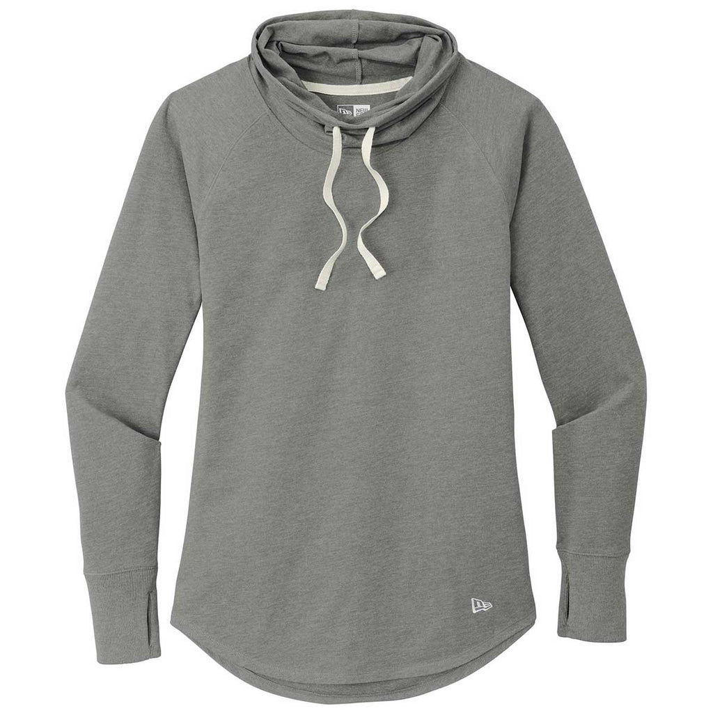 Head out for a morning jog or to that morning meeting in comfort with a custom New Era Women's Shadow Grey Heather Sueded Cotton Blend Cowl Tee. Made of a combination of sueded ring spun cotton and poly, this tee will look great with the screen print of your choice. The relaxed fit of this long sleeve tee means comfort all day. Small additions like contrast twill drawcords, rib knit cuffs, a curved drop tail hem, and thumbholes create a unique look for this tee that would serve well as an end of the year gift with a company logo. Your screen print will stand out whether used as company uniforms or employee gifts that will be a real hit.