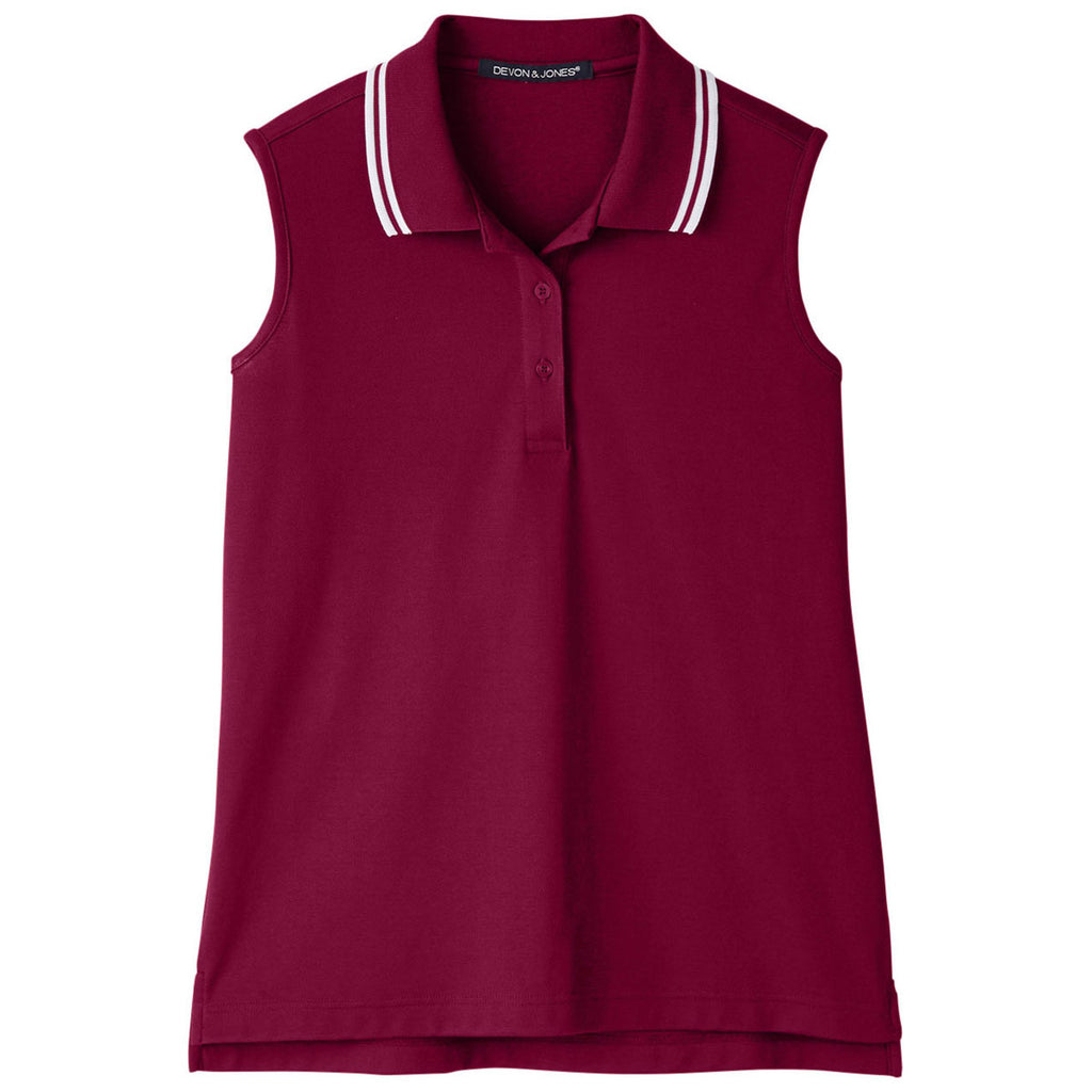 Have a bit of fun with a custom Devon & Jones Women's Burgundy/White CrownLux Performance Plaited Tipped Sleeveless Polo. This unique dual colored look has a gorgeous look, but in the comfort of a sleeveless top. The polyester cotton blend is perfect for the workplace as employee apparel with a company logo or to give as a custom gift with the embroidery of your choice. Simply wear under a jacket for a look that goes from the office to the club with ease. The active fit paired with easy care allows for freedom of movement throughout your day. The hi-low hemline adds a bit of coverage to this choice apparel.Highlights
