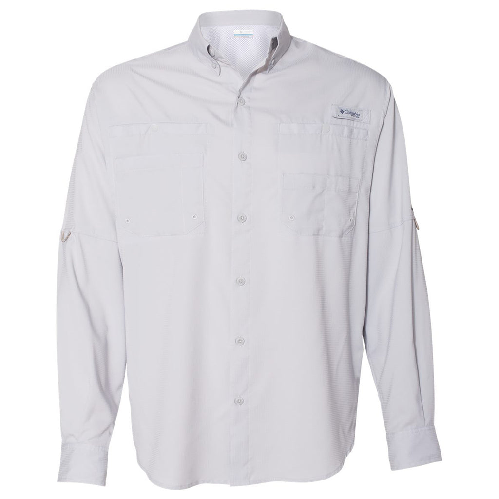 Create a corporate logo for the Columbia Men's Cool Grey PFG Tamiami Long Sleeve Shirt. This all-around polyester ripstop shirt offers Omni-SHADE UPF 40 sun protection, Omni-WICK quick dry, and roll-up sleeves to wear year-round as you work your hardest or enjoy the Great Outdoors using the built-in rod holder.This product cannot ship outside of the United States.