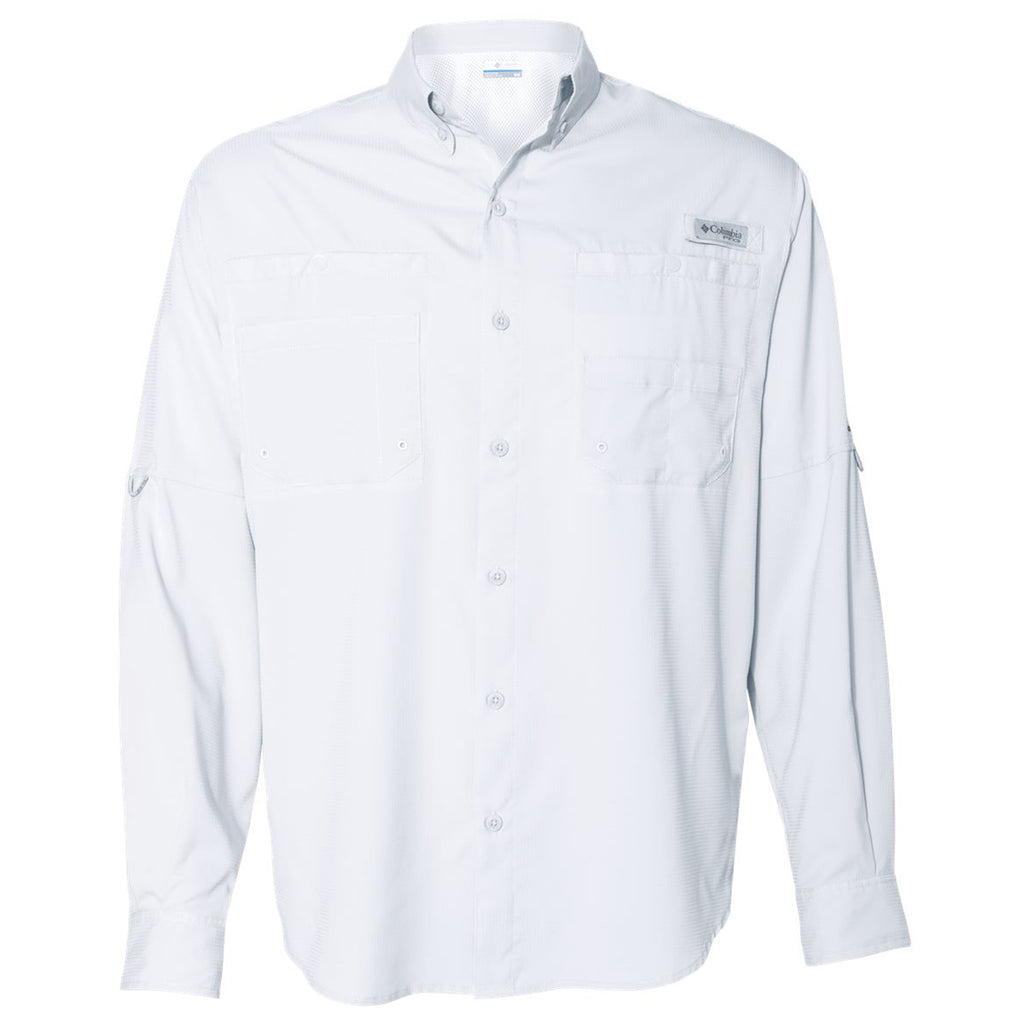Create a corporate logo for the Columbia Men's White PFG Tamiami Long Sleeve Shirt. This all-around polyester ripstop shirt offers Omni-SHADE UPF 40 sun protection, Omni-WICK quick dry, and roll-up sleeves to wear year-round as you work your hardest or enjoy the Great Outdoors using the built-in rod holder.This product cannot ship outside of the United States.