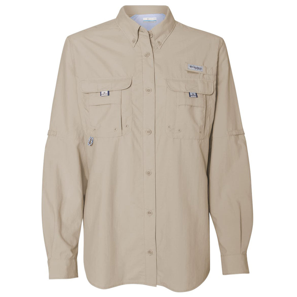 Columbia Women's Fossil PFG Bahama Long Sleeve Shirt with embroidery is a durable way to enjoy being outdoors. The 100% Tactel nylon is tough yet comfortable for all-day wear. Made with Omni-SHADE UPF 50 sun protection and quick dry technology with a vented back, this is a must-have for those who work and play hard.This product cannot ship outside of the United States.