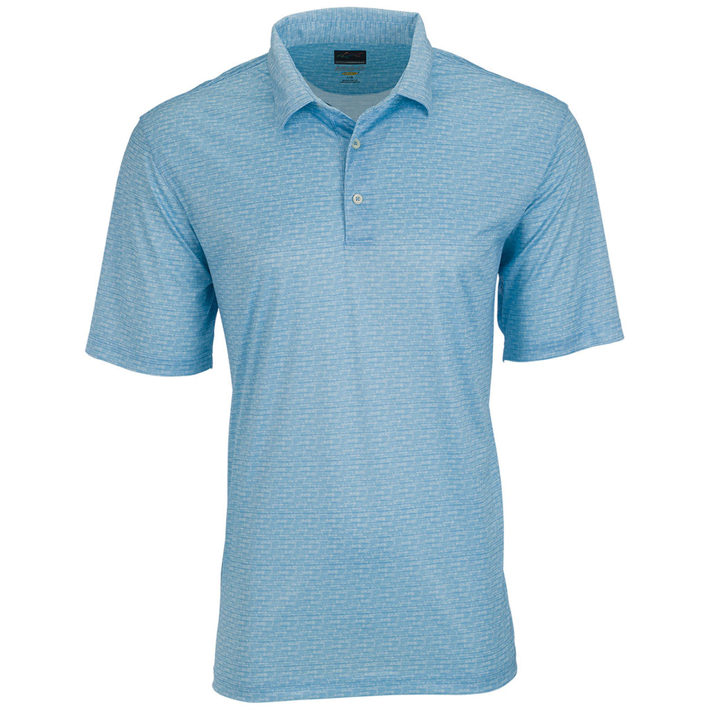 Design a custom logo for the Greg Norman Men's Misty Blue Microlux Cart Print Polo. Made with Play Dry performance and a UPF 50+, this three-button placket polo with a tonal print will turn heads whether used as a unique uniform, corporate wear, or to show off at the driving range. Place an order right away.Highlights