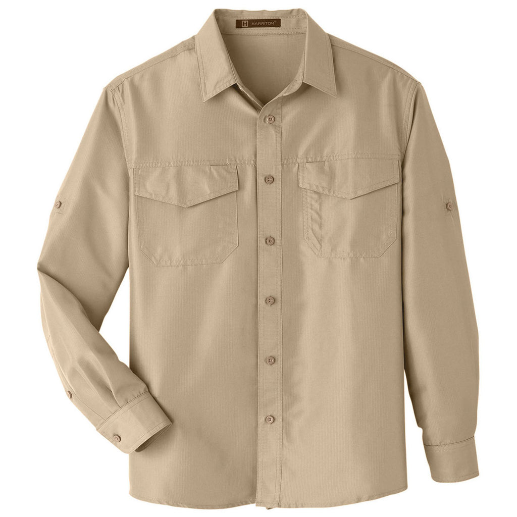 Add a company logo to the Harriton Men's Khaki Key West Long-Sleeve Performance Staff Shirt to create a uniform that gives the professional look with a comfortable feel. Made of polyester ripstop, this shirt will hold up to the hard work required for your company and provide employee apparel you are proud to share. The anti-microbial, UV protection, and moisture wicking properties keep everyone looking their best with a custom logo that will stand out. A full button front offers dual chest pockets for small items and the easy care design means daily wear is not a problem.Corresponding Women's Style: Harriton Women's Khaki Key West Long-Sleeve Performance Staff Shirt