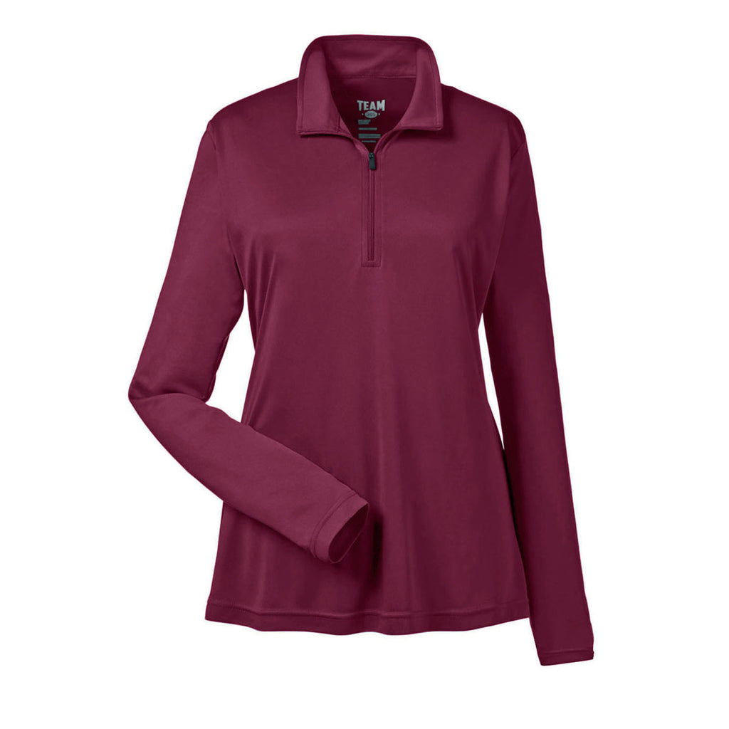 Team 365 Women's Sport Maroon Zone Performance Quarter-Zip long-sleeve top does it all: it provides moisture-wicking and UV protection performance, resists odor, reflects in low-light conditions and contours the form for an athletic fit. It features a center front coil zipper with semi autolock slider and a no-fuss heat-sealed label. Understanding/acknowledging the fact that customization is key to today's businesses, we offer a quick and reliable custom logo services on a variety of performance clothing items including this women's quarter zip that's equally perfect for corporate giveaways, your workforce or anyone with an active lifestyle.Corresponding Men's Style: Team 365 Men's Sport Maroon Zone Performance Quarter-Zip