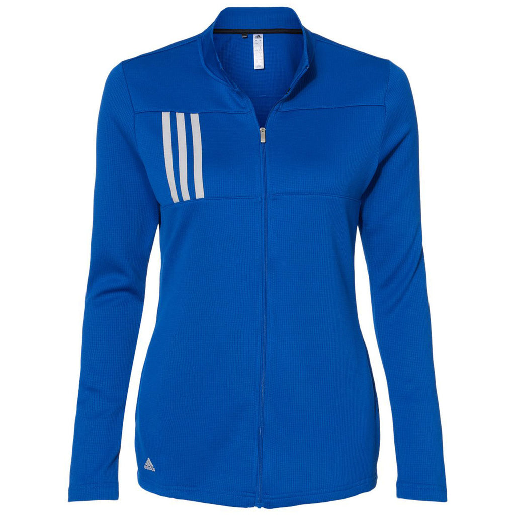 Your custom logo will stand out on the adidas Women's Team Royal/Grey Two 3-Stripes Double Knit Full-Zip made of 100% recycled polyester. The beautiful waffle texture knit construction has a self-collar and moisture management properties to keep you looking and feeling your best as you go about your day. Add a company logo to offer as employee gifts or as a unique choice for employee apparel. The full zip style allows for easy on and off of the double knit whether you are headed out on your morning commute or going for a jog in the park.