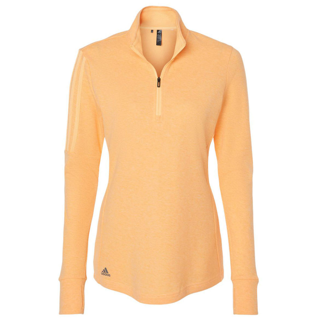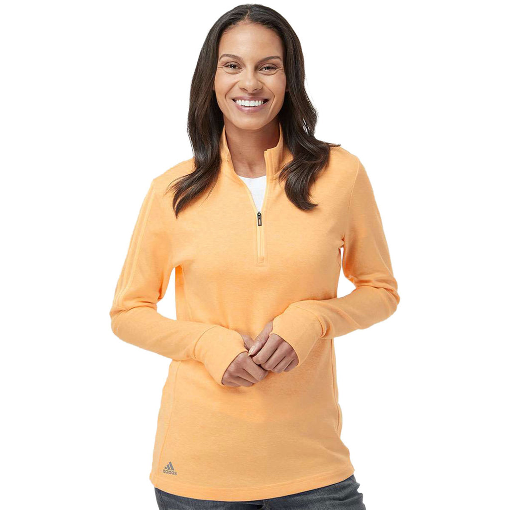 Women who love getting active will appreciate the functionality of the adidas Women's Acid Orange Melange 3-Stripes Quarter Zip Pullover. Made from a special moisture-wicking fabric, this hooded sweatshirt features a sleek silhouette and a variety of on-trend color options. All it's missing is your company's custom logo or design.