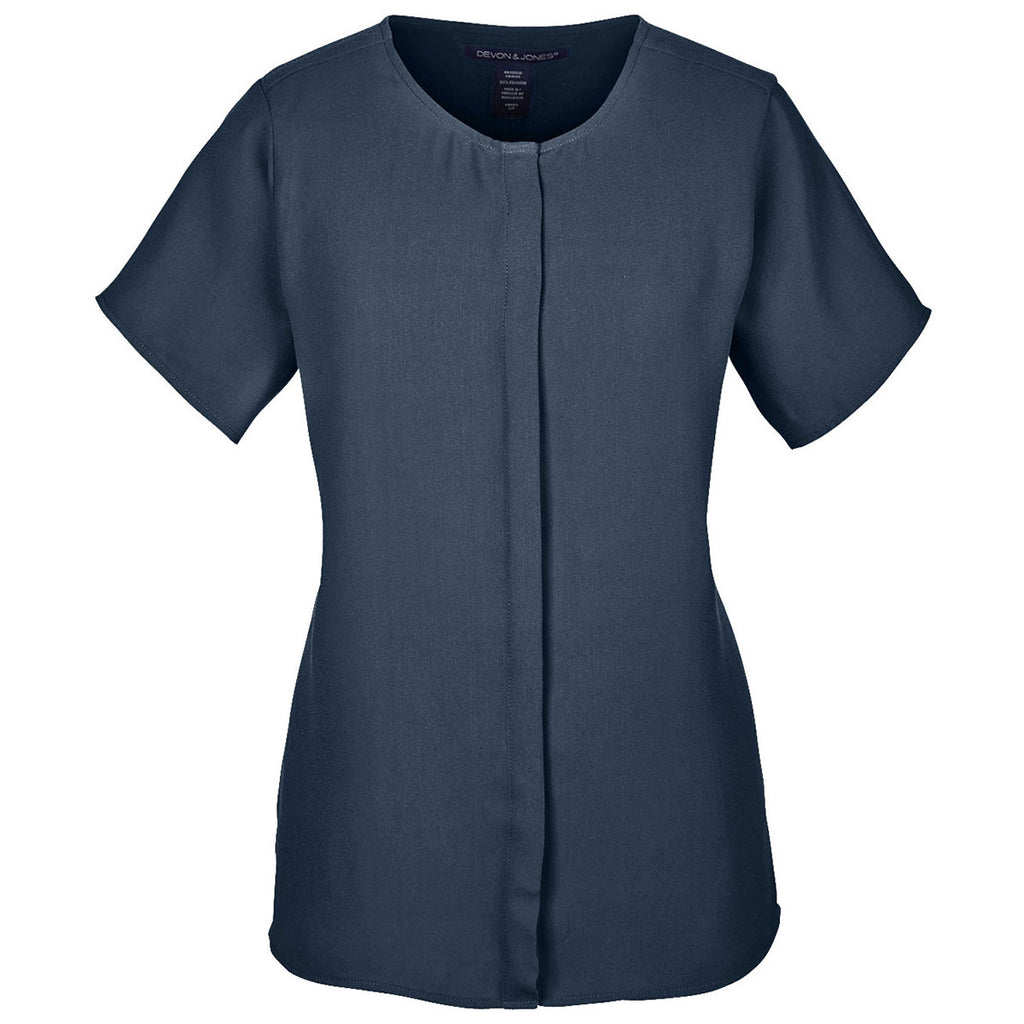 Add embroidery to the Devon & Jones Wome Navy Perfect Fit Short-Sleeve Crepe Blouse for corporate apparel that is fun to wear. This simple, 100% polyester crepe blouse is stylish, yet simple so it can be easily layered or worn alone as needed. In button up style, the buttons are incorporated in a hidden center front placket. Created with the flattering "perfect fit" with side slits, you can add a company logo to use for an employee event in which your workers need to be recognizable or a custom logo to add to your logoed apparel line.Highlights
