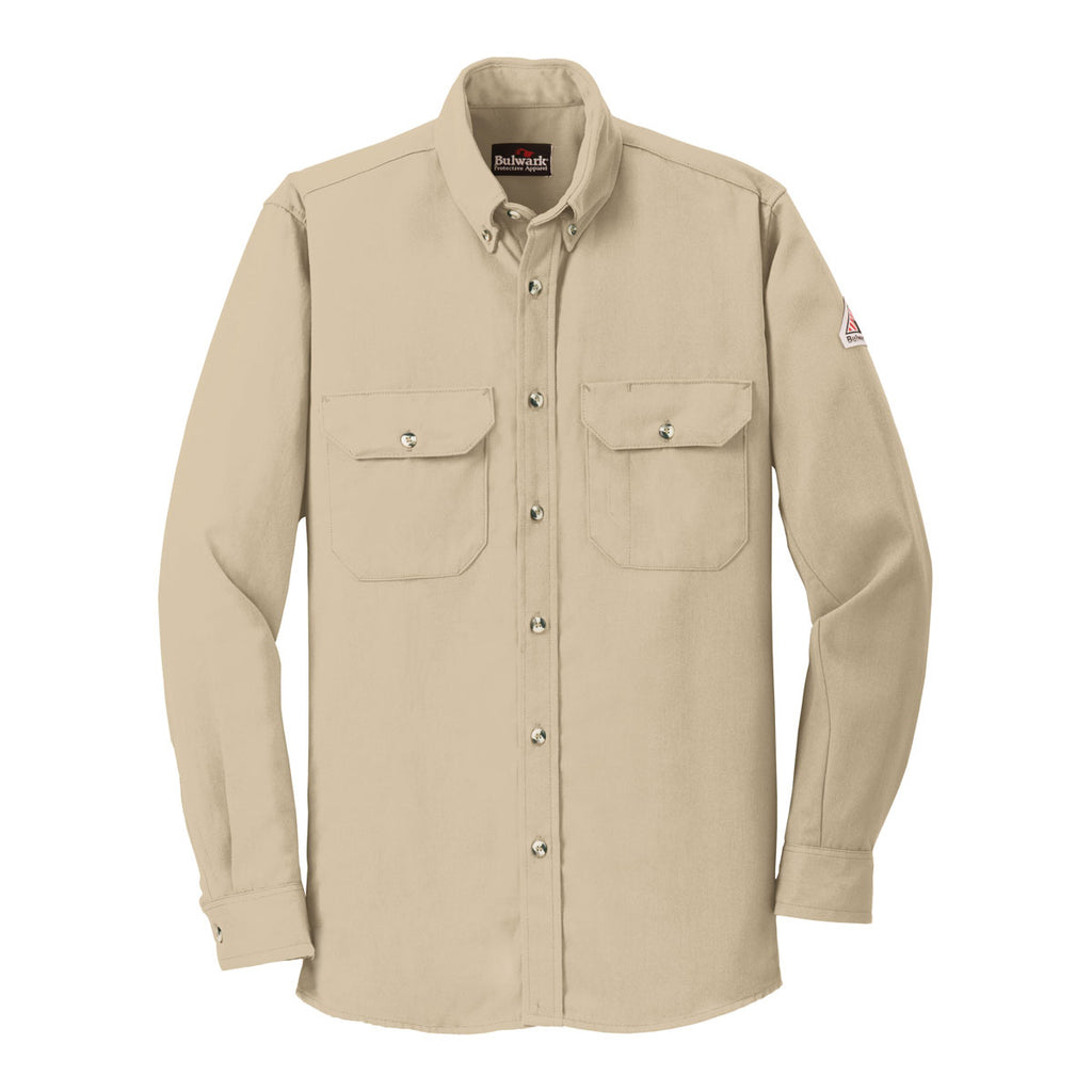 Construction worker safety comes first in the form of the Bulwark Khaki EXCEL FR ComforTouch Dress Uniform Shirt. The stylish work shirt works well for construction project managers, as well as construction workers that benefit from fire retardant Westex Ultrasoft. The 88% workwear shirt also include 12% nylon to prevent the shirt from tearing, whenever a construction worker snags it on a sharp, protruding object. Bulwark designed the top stitched button down uniform shirt to include two chest pockets that store small construction tools and electronic devices. Tailored sleeve packets enhance the visual appeal of the ComforTouch Uniform Shirt.
