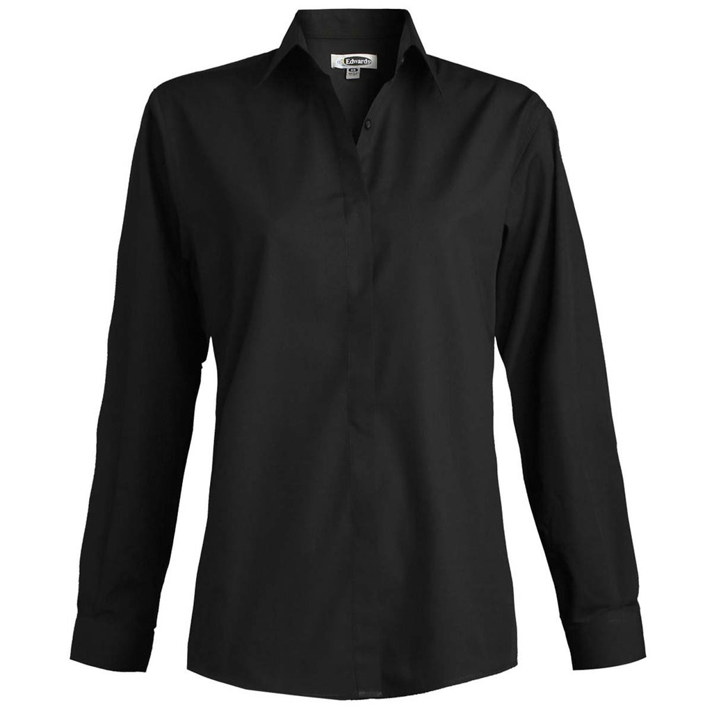 This custom Edwards Women's Black Cafe Long Sleeve Shirt will work as hard as you do in performance broadcloth. Available in a variety of classic and unique colors this polyester rich cotton blend offers long sleeves and adjustable cuffs so a professional look is created that can be used as employee apparel or corporate uniforms as needed. Add a company logo to use these as part of hospitability apparel at big events or each day as you put your best foot forward with each and every customer or client. Place an order in the color of your choice and embroidery that best represents your brand.Highlights
