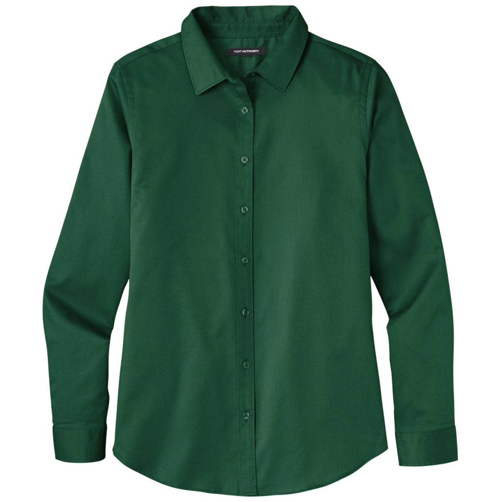 Up your game with a custom Port Authority Women's Dark Green Long Sleeve SuperPro React. The ultimate in professional wear with a performance side, this long sleeve button up is made for both work and play. Perfect to add a company logo to and use as corporate apparel with a blazar, this top offers lots of extras like wrinkle resistance, Easy Care, and stain release for convenience. The soft, smooth fabric creates a polished look whether eating lunch or taking a meeting. Add a custom logo to create a great look for a special event in which you need to look great, but remain comfortable.Corresponding Men's Style:Port Authority Men's Dark Green Long Sleeve SuperPro React Twill Shirt