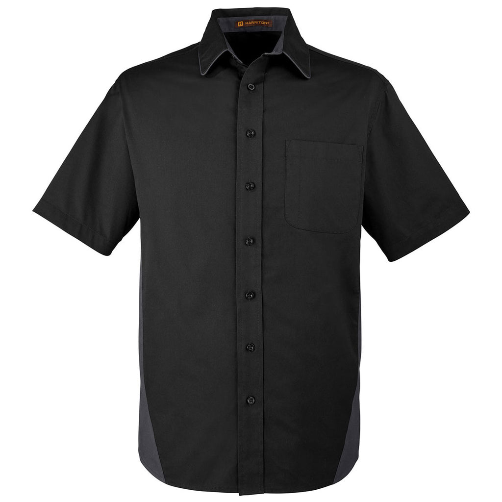 Design a custom logo for the Harriton Men's Black/Dark Charcoal Flash Colorblock Short Sleeve Shirt for a unique look that will stand out in a crowd. This gorgeous colorblocked design made of a cotton, polyester twill has pops of color in just the right spots. Create employee apparel that looks and feels great with dyed to match buttons and contrast side vents to really stand out. Add a company logo and choose colors to represent your company in this short sleeve shirt that will keep employees looking and feeling good with wrinkle resistant, stain release fabric that will last a long time with daily wear.Corresponding Women's Style:Harriton Women's Black/Dark Charcoal Flash Colorblock Short Sleeve Shirt