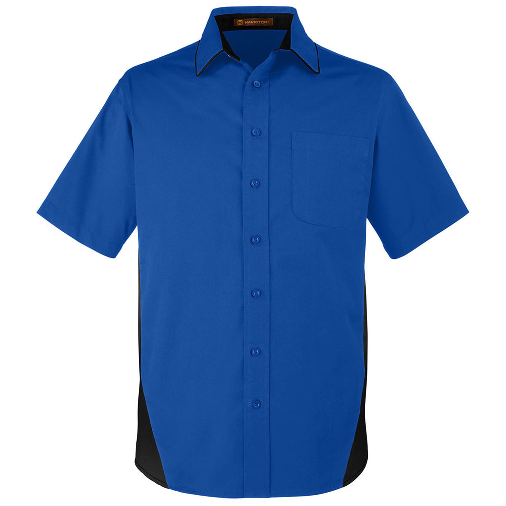Design a custom logo for the Harriton Men's True Royal/Black Flash Colorblock Short Sleeve Shirt for a unique look that will stand out in a crowd. This gorgeous colorblocked design made of a cotton, polyester twill has pops of color in just the right spots. Create employee apparel that looks and feels great with dyed to match buttons and contrast side vents to really stand out. Add a company logo and choose colors to represent your company in this short sleeve shirt that will keep employees looking and feeling good with wrinkle resistant, stain release fabric that will last a long time with daily wear.Corresponding Women's Style:Harriton Women's True Royal/Black Flash Colorblock Short Sleeve Shirt