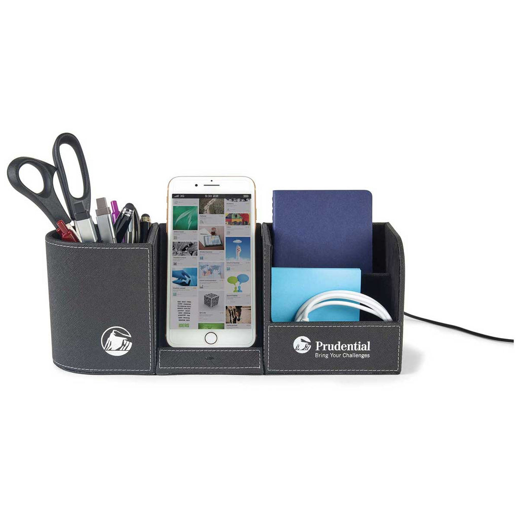 Make your desk clutter-free with the custom GGemline Black Truman Wireless Charging Desk Organizer - put your office desk necessities or personal items in one place and even charge up a wireless-charging capable device. Organizer pieces can be magnetically attached for maximum storage flexibility. Turn the piece into an event giveaway for trade shows and recruiting events - advertise your brand by adding your company logo or name.