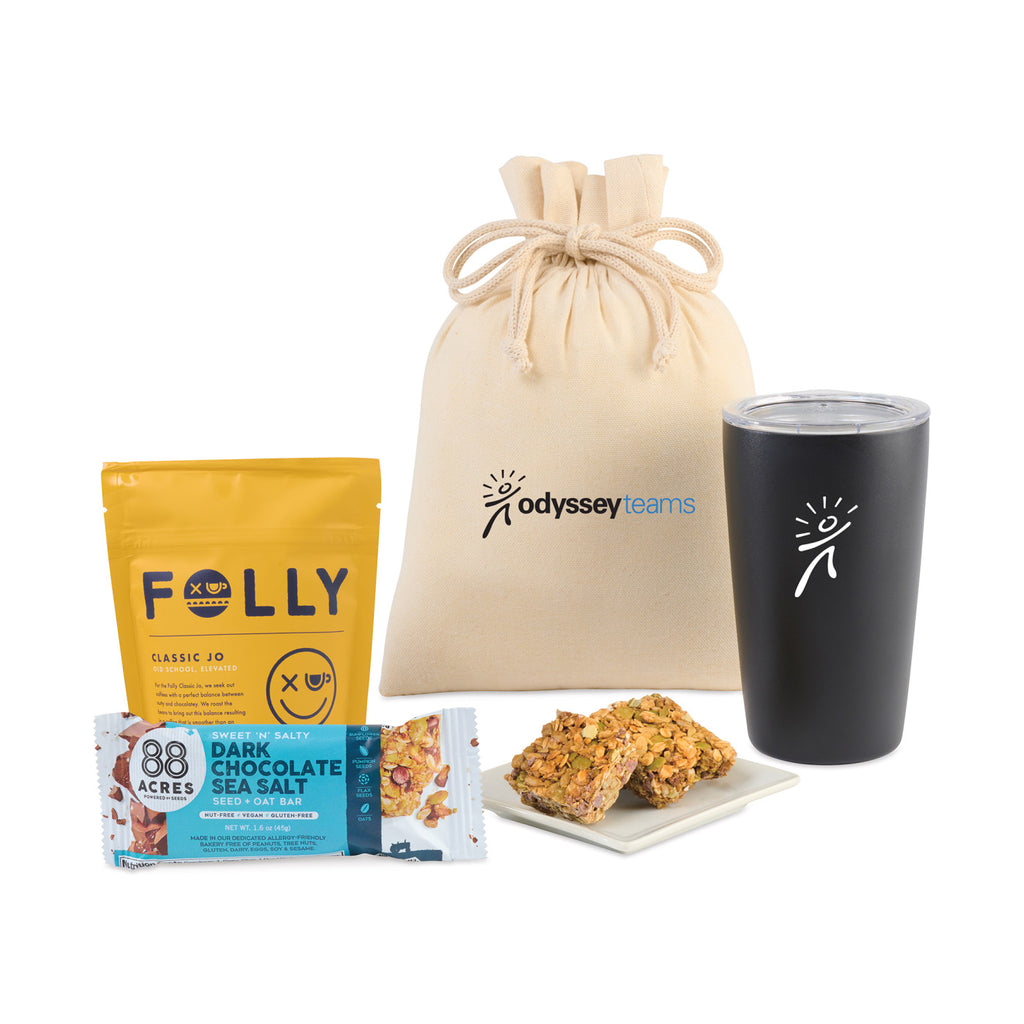 Commuters will surely love what this custom Gourmet Expressions Black Powder The MiiR Commuter Gift Set packs - a coffee packet, a dark chocolate sea salt seed bar and the MiiR 12 oz. Tumbler that's sized for travels. This set is all packed inside a reusable drawstring bag. Gift your team or use the set as an event giveaway for trade shows and recruiting events.