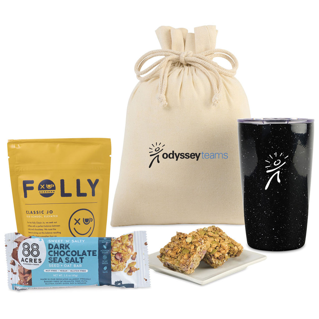 Commuters will surely love what this custom Gourmet Expressions The MiiR Black Speckle Commutter Gift Set packs - a coffee packet, a dark chocolate sea salt seed bar and the MiiR 12 oz. Tumbler that's sized for travels. This set is all packed inside a reusable drawstring bag. Gift your team or use the set as an event giveaway for trade shows and recruiting events.
