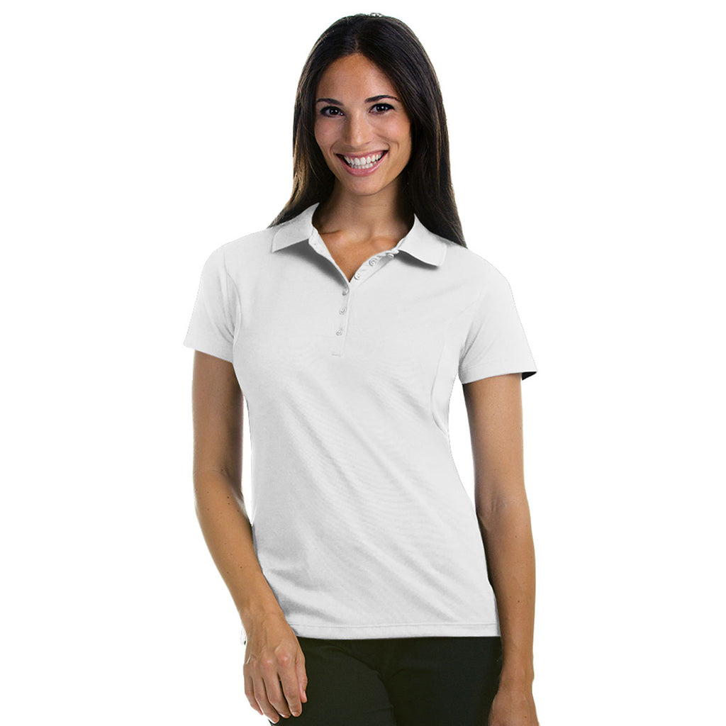 When other golfers wear down on the back nine, you will surge past them into the lead because of the gentle comfort offered by the embroidered Antigua Women's White Pique Xtra-Lite Polo. The lightweight fabric remains dry and comfortable throughout the day because of moisture management technology. Display the custom logo attached on the large imprint area, and take your brand recognition to the next level. With a logo, you demonstrate the pride you have in your company and spread the word about your business around the community. Wear the versatile polo for work and play.Corresponding Men's Style: Antigua Men's White Pique Xtra-Lite Polo