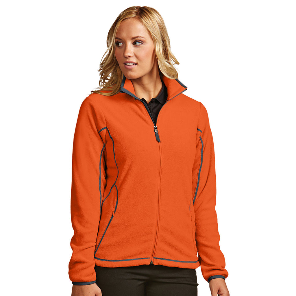 Enjoy comfort year round by ordering the corporate embroidered Antigua Women's Mango/Steel Ice Jacket. Designed for each of the four seasons, the jacket makes the perfect gift to thank the hard working employees who generate most of your sales. The micro polyester fleece jacket withstands the punishment delivered by your active lifestyle. Wear the jacket while playing golf, as well as when you leave it all behind during an extended camping trip. Attach your company logo to give your brand credibility in the community. With a custom logo, you reach more potential customers and increase your brand awareness.Highlights