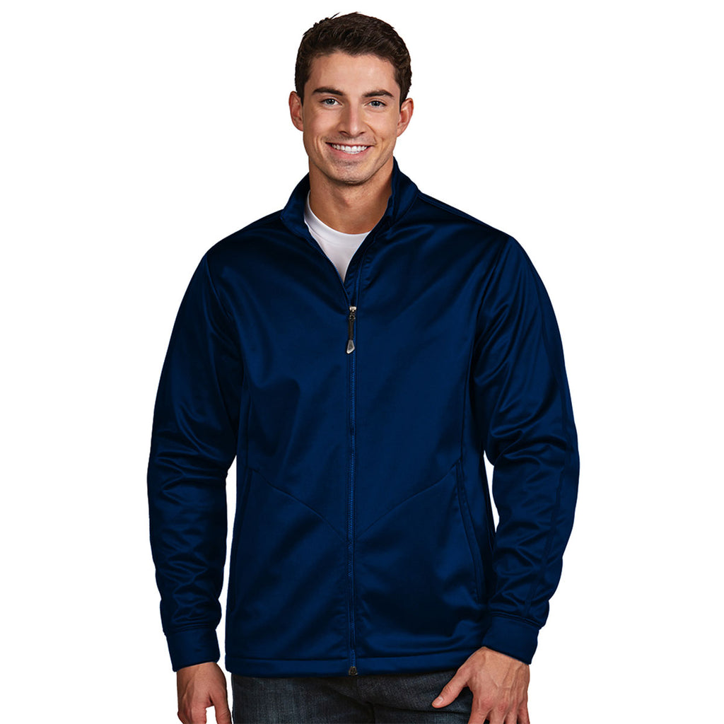 Designed for golfers of all skill levels, the corporate logoed Antigua Men's Navy Golf Jacket makes the perfect gift for everyone who signs up for the next company sponsored golf outing. Just remember to add a custom logo to help players remember the products and services your company offers. Enjoy the waterproof polyester fabric that resists rips and tears. Dyed to match taping detail at the collar, sleeves, shoulders, and hand pocket flap create a sleek appearance that shows you like to golf in style. Moisture wicking technology keeps you cool and comfortable during an intense round, and doesn't impede your ability to win.Corresponding Women's Style: Antigua Women's Navy Golf Jacket