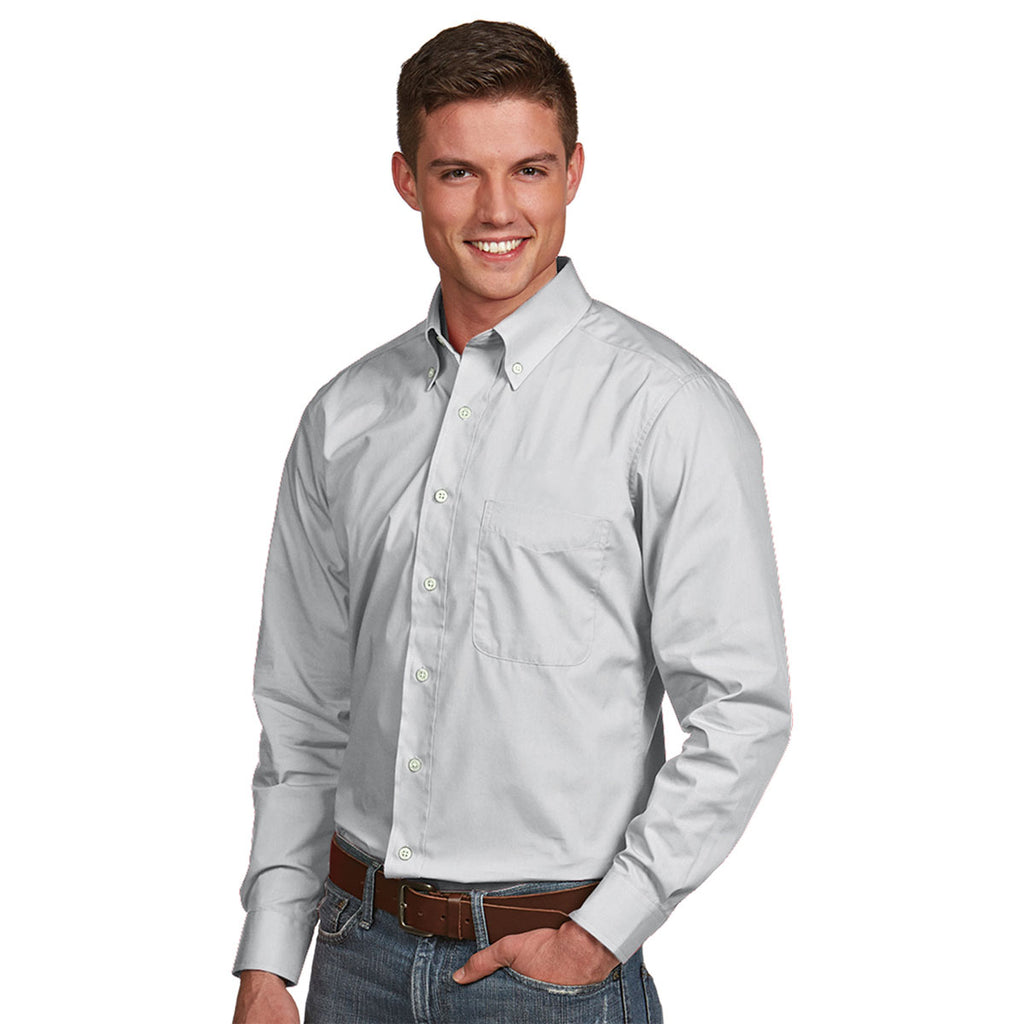 Outfit your team with their new trade show attire by choosing the corporate embroidered Antigua Men's Light Silver Dynasty Shirt for your next custom apparel order. The versatile button down long sleeve shirt is the ideal layering garment for active professionals. Super smooth cotton and durable polyester blend together seamlessly to resist wrinkles and stains. Attach your company logo on the large imprint area to reach more potential customers at business conferences. Your team will look polished and professional when they are sporting this Antigua shirt with your embroidered logo at the next event. When it comes to comfortable dress shirts, it doesn't get much better than this.Corresponding Women's Style: Antigua Women's Light Silver Dynasty Shirt