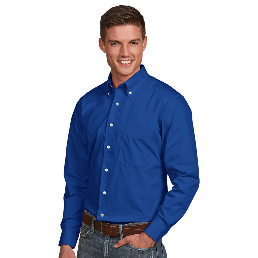 Outfit your team with their new trade show attire by choosing the corporate embroidered Antigua Men's Dark Royal Dynasty Shirt for your next custom apparel order. The versatile button down long sleeve shirt is the ideal layering garment for active professionals. Super smooth cotton and durable polyester blend together seamlessly to resist wrinkles and stains. Attach your company logo on the large imprint area to reach more potential customers at business conferences. Your team will look polished and professional when they are sporting this Antigua shirt with your embroidered logo at the next event. When it comes to comfortable dress shirts, it doesn't get much better than this.Corresponding Women's Style: Antigua Women's Dark Royal Dynasty Shirt