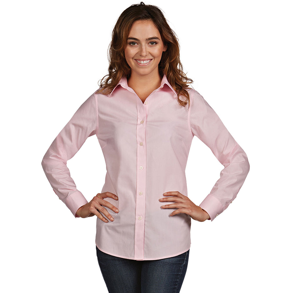 Create a corporate apparel must-have by giving away the custom logoed Antigua Women's Mid Pink Dynasty Shirt. Even when your workday spirals with added tasks and projects, the classically designed stylish shirt will present a polished professional image. The tail bottom gives you plenty of fabric to tuck the business shirt into a pair of dress pants or a skirt. Cotton and polyester combine to produce the one-two company apparel punch of super soft feel and long lasting durability. Add your corporate logo on the large imprint area to promote your company at company events and industry trade shows.Highlights