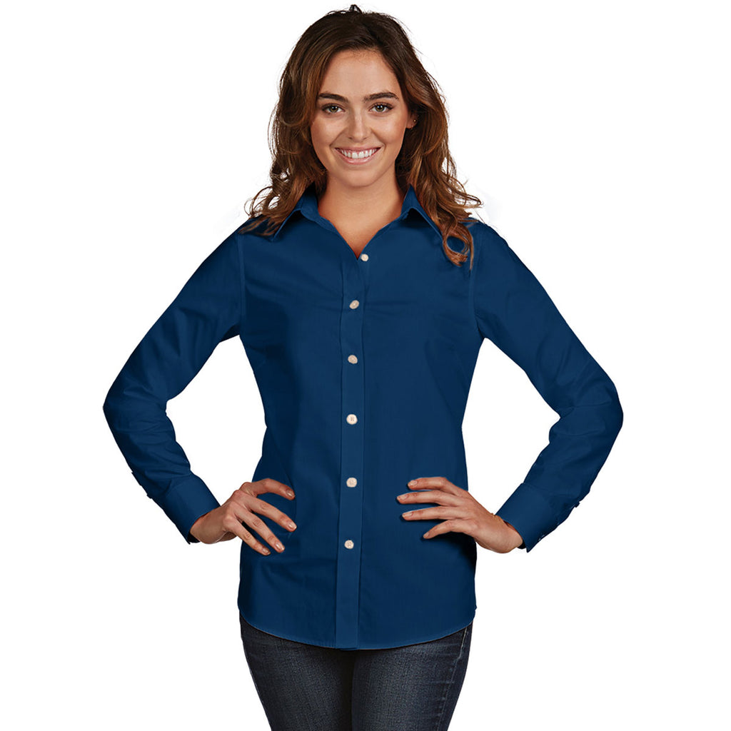 Create a corporate apparel must-have by giving away the custom logoed Antigua Women's Navy Dynasty Shirt. Even when your workday spirals with added tasks and projects, the classically designed stylish shirt will present a polished professional image. The tail bottom gives you plenty of fabric to tuck the business shirt into a pair of dress pants or a skirt. Cotton and polyester combine to produce the one-two company apparel punch of super soft feel and long lasting durability. Add your corporate logo on the large imprint area to promote your company at company events and industry trade shows.Corresponding Men's Style: Antigua Men's Navy Dynasty Shirt