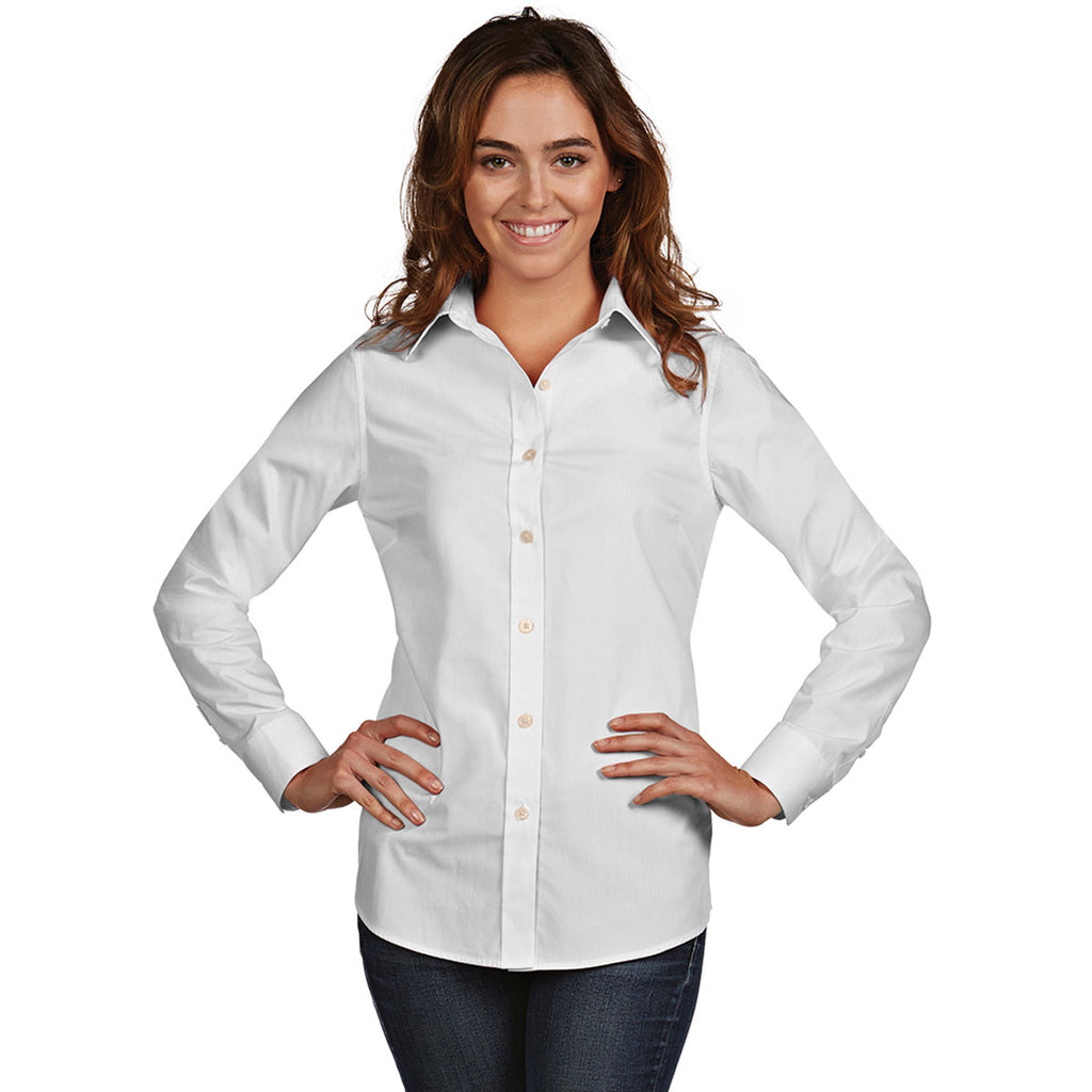Create a corporate apparel must-have by giving away the custom logoed Antigua Women's White Dynasty Shirt. Even when your workday spirals with added tasks and projects, the classically designed stylish shirt will present a polished professional image. The tail bottom gives you plenty of fabric to tuck the business shirt into a pair of dress pants or a skirt. Cotton and polyester combine to produce the one-two company apparel punch of super soft feel and long lasting durability. Add your corporate logo on the large imprint area to promote your company at company events and industry trade shows.Corresponding Men's Style: Antigua Men's White Dynasty Shirt