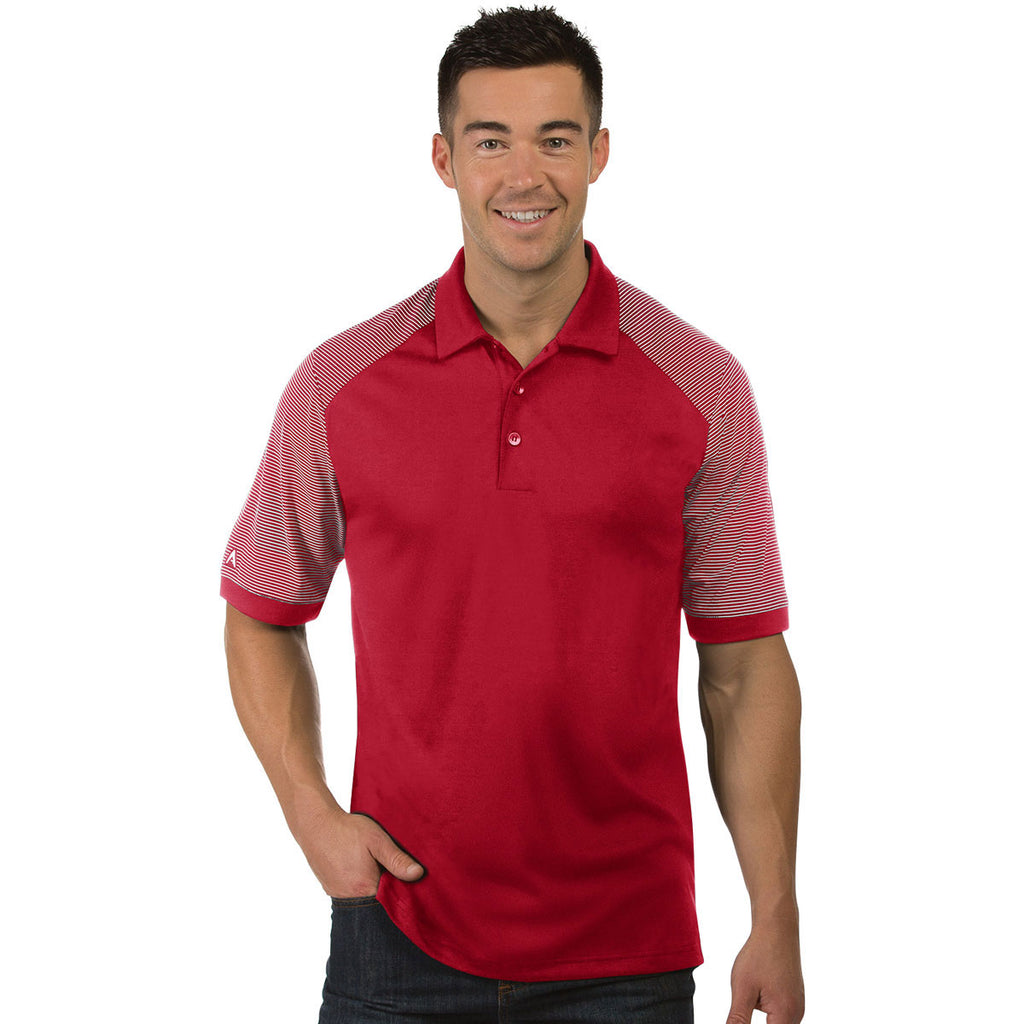 Make a statement with Antigua Men's Cardinal Red/White Engage two-toned, polyester with Desert Dry moisture wicking jersey. The yarn dye mini-stripe on the sleeves and top shoulder add just a bit of extra to this already impressive look. Add a custom logo to the color(s) of your choice and use these shirts as employee apparel or gifts for the next recruiting event. Stylish and professional enough to wear as corporate apparel, the self-fabric collar, 3 button placket, and Antigua's triangle patch on the right sleeve will have you looking and feeling your best no matter the environment. Create your custom design and place an order today.Highlights