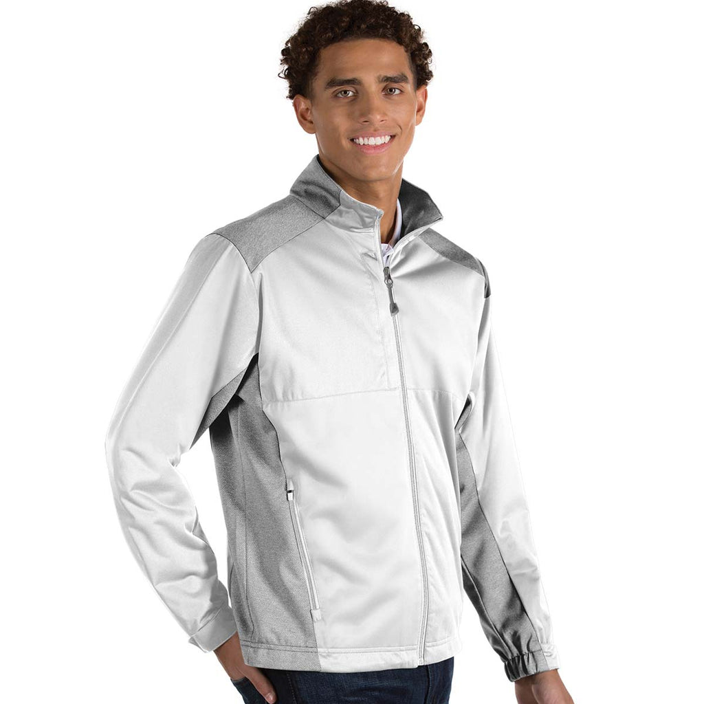 The logoed Antigua Men's White/Light Grey Heather Revolve Full Zip offers classic style and warmth for the wearer to enjoy. With 15 color options available, you are certain to find one which goes great with much of your wardrobe. Some of the features which you're certain to love with this full zip jacket include the comfortable 100% polyester material, the interlock face which is bonded to the waterproof membrane long-sleeve wind shirt, contrast insets, contrast stitch on the zipper tape, zipper hand pockets, zipper chest pocket, bungee toggle hem, and hook and loop closure. Add your custom embroidery and hand these jackets out to your loyal and hardworking employees as employee apparel.Corresponding Women's Style: Antigua Women's White/Light Grey Heather Revolve Full Zip