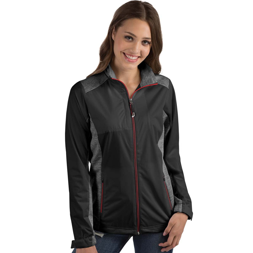 The corporate embroidery logo Antigua Women's Black/Dark Red Revolve Full Zip is available in 12 vibrant colors. Features of this full zip jacket include a 100% polyester fabric for utmost comfort, an interlock face which is bonded to a waterproof membrane long-sleeve wind shirt, contrast bonded insets, bungee toggle bottom, hook and loop closure, and handy pockets. When you add your corporate logo to the jacket, you have a wonderful clothing item which also advertises the name of your business. This is the perfect gift to give to employees as corporate apparel.Corresponding Men's Style: Antigua Men's Black/Dark Red Revolve Full Zip
