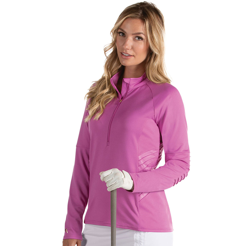 Practicing your putt has never looked as good as with the Antigua Women's Jam Luxe micro brushed half zip pullover. Though the Antigua "A" logo at the bottom hem shows style, a custom logo will show company or team pride with flair. Available in five basic and bold colors the side edging adds a bit of something extra to an already professional, yet comfortable pullover. Made of polyester and spandex, this pullover could serve as employee apparel with a carefully placed company logo. So, whether you are planning a recruiting event or have a booth at an upcoming trade show, choose your colors and custom embroidery with care to showcase your company in the best light. Antigua will get you noticed.Highlights