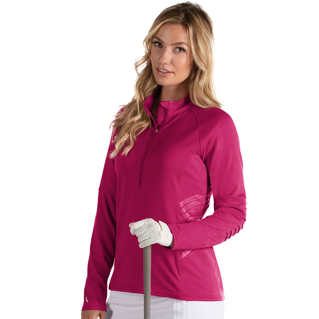 Practicing your putt has never looked as good as with the Antigua Women's Radish Luxe micro brushed half zip pullover. Though the Antigua "A" logo at the bottom hem shows style, a custom logo will show company or team pride with flair. Available in five basic and bold colors the side edging adds a bit of something extra to an already professional, yet comfortable pullover. Made of polyester and spandex, this pullover could serve as employee apparel with a carefully placed company logo. So, whether you are planning a recruiting event or have a booth at an upcoming trade show, choose your colors and custom embroidery with care to showcase your company in the best light. Antigua will get you noticed.Highlights