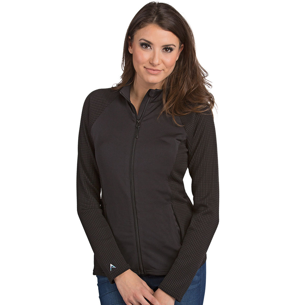 The seasons are changing, stay comfortable with the Antigua Women's Black Sonar full zip jacket. Made of a polyester, spandex blend, the full zip jacket is a great option for employee apparel especially at recruiting events and trade shows when the weather can get chilly throughout the day. Add a company logo to build brand recognition every time this moisture wicking, form fitting jacket is worn or displayed. The waffle knit sleeves and side insets, raglan armholes, open cuff and hem add to the stylish simplicity that makes this jacket a favorite. Place your order before the next big event to have yourself and employees display a look that will turn heads.Corresponding Men's Style: Antigua Men's Black Sonar