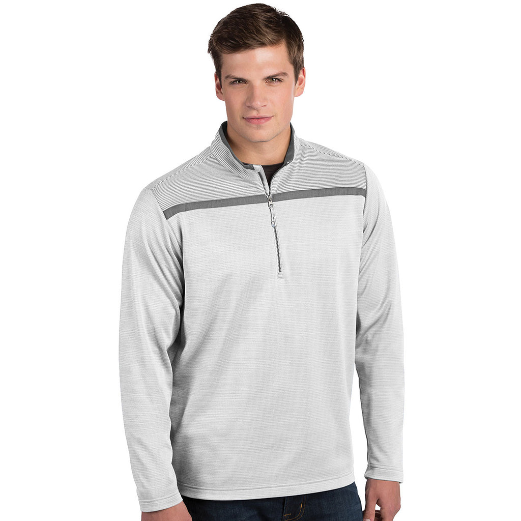 A pullover is a must have with unpredictable weather and the Antigua Men's White/Bedrock Cryptic quarter zip pullover is no exception. Available in a variety of unique colors, the 100% polyester Desert Dry moisture wicking pullover offers a unique detail in the Oxford pattern woven chest stripe. Choose your custom embroidery to show company affiliation when taking part in a golf event or looking for the next team member at a recruiting event. These pullovers are so well made that offering them as employee apparel or even gifts will have everyone wanting to be part of your realm of influence. Choose your company logo and place an order today!Highlights