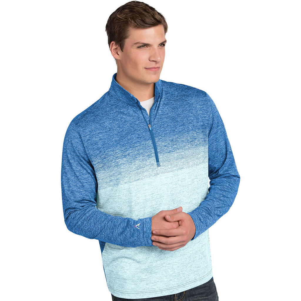 Style and fashion forward thinking come together in the Antigua Men's Laguna/Frost Marina quarter zip pullover. Standard with an hombre look in several colors, the open cuffs and bottom hem make this pullover comfortable to wear with a professional look. Ideal for a golf event in which the weather is unpredictable or a trade show in which your company needs recognition with a custom logo on the employee apparel. The Antigua triangle patch on the right sleeve is a true sign of quality from the Antigua brand. A custom embroidery can serve a host of purposes from adding credibility at a recruiting event to serving as a form of advertising when given away as gifts.Highlights