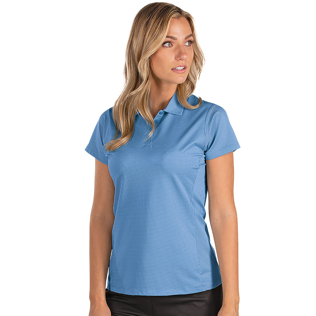 Professionalism meets style in the Antigua Women's Frost/Laguna Scope with short sleeves. Idea for the office, trade shows, or just to look and feel your best, this spandex, polyester blend offers princess seams and a self-collar. Available in a range of sizes, the Women's Scope can be embroidered with your corporate logo or custom design. Imagine the excitement if these were offered at your next recruiting event or the team spirit felt at a golf event. Start choosing the colors and design for your custom polo shirts today to place your order. You and your employees will feel great and look even better with this addition to the wardrobe.Highlights