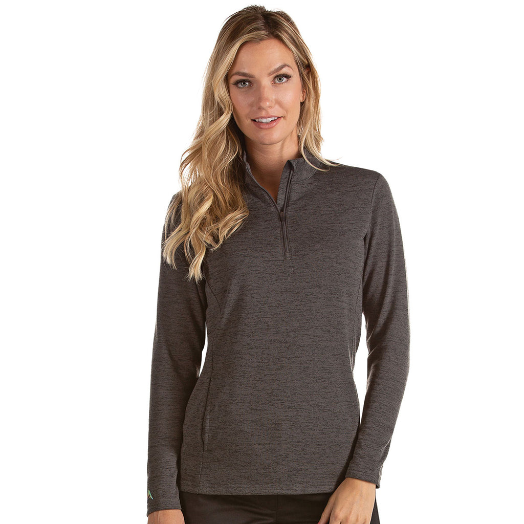 Antigua Women's Bedrock Bonsai heavy weight pullover with long sleeves is perfect for those cooler days spent at trade shows. Add a company logo and use these quarter zip pullovers as part of employee apparel for those who need to be both in and outdoors during the work day. Made of a polyester rich, spandex blend the Desert Dry moisture wicking makes this custom logoed pullover a must have when the weather starts to turn. Perfect for a golf event or recruiting event, the open cuffs and bottom hem with fitted design allows for all day comfort. Place your order before the next big event.Corresponding Men's Style: Antigua Men's Bedrock Bonsai
