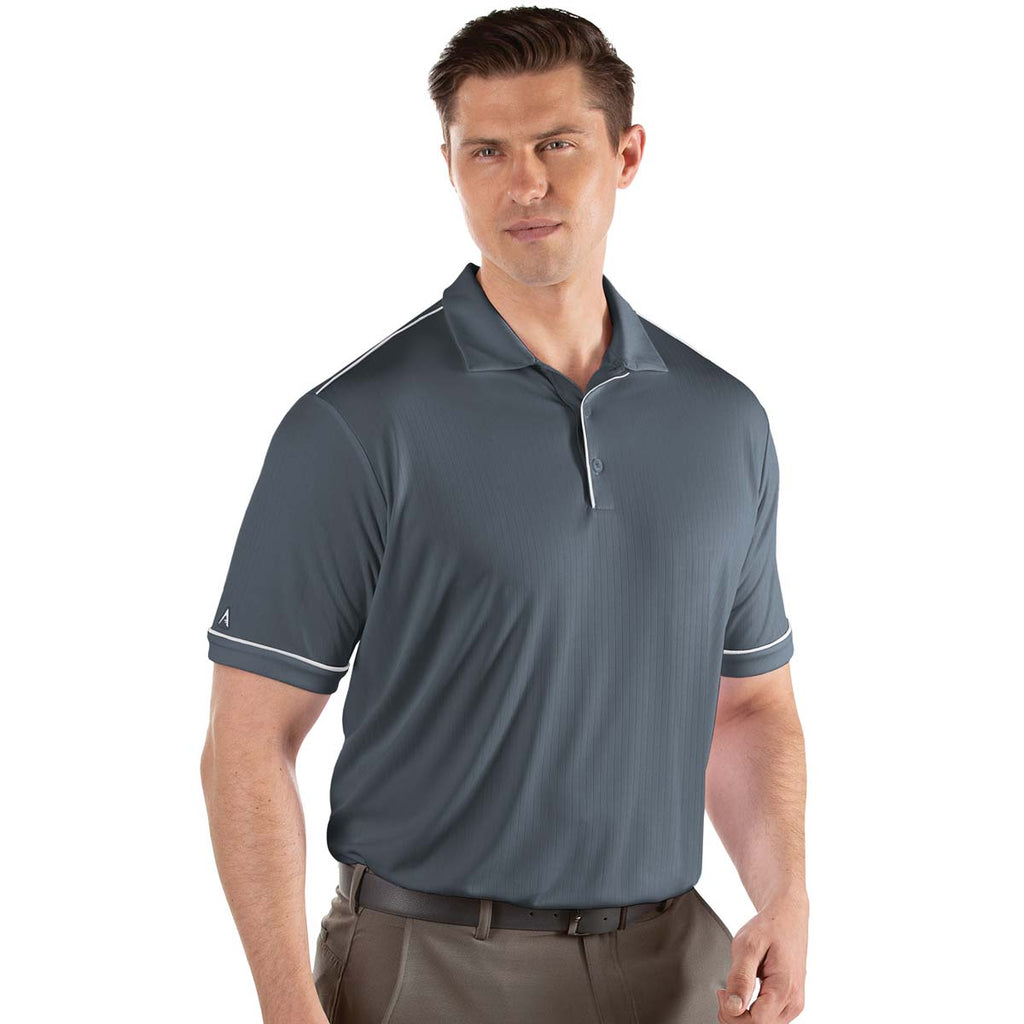 The embroidery logoed Antigua Men's Steel/White Salute Polo comes in seven classic colors and exudes style from top to bottom. Some of the extraordinary must-have features of this polo shirt include a comfortable 100% polyester fabric, Desert Dry moisture wicking technology, self-fabric collar featuring an open cuff, three-button closure, and contrast tipping at the placket, forward shoulder, and cuff seam. This stylish men's polo is an excellent corporate apparel wear gift to hand out at trade shows, golf events or recruiting events. As an extra-special feature, your embroidery logo will look fabulous on this exquisite shirt.Corresponding Women's Style: Antigua Women's Steel/White Salute Polo