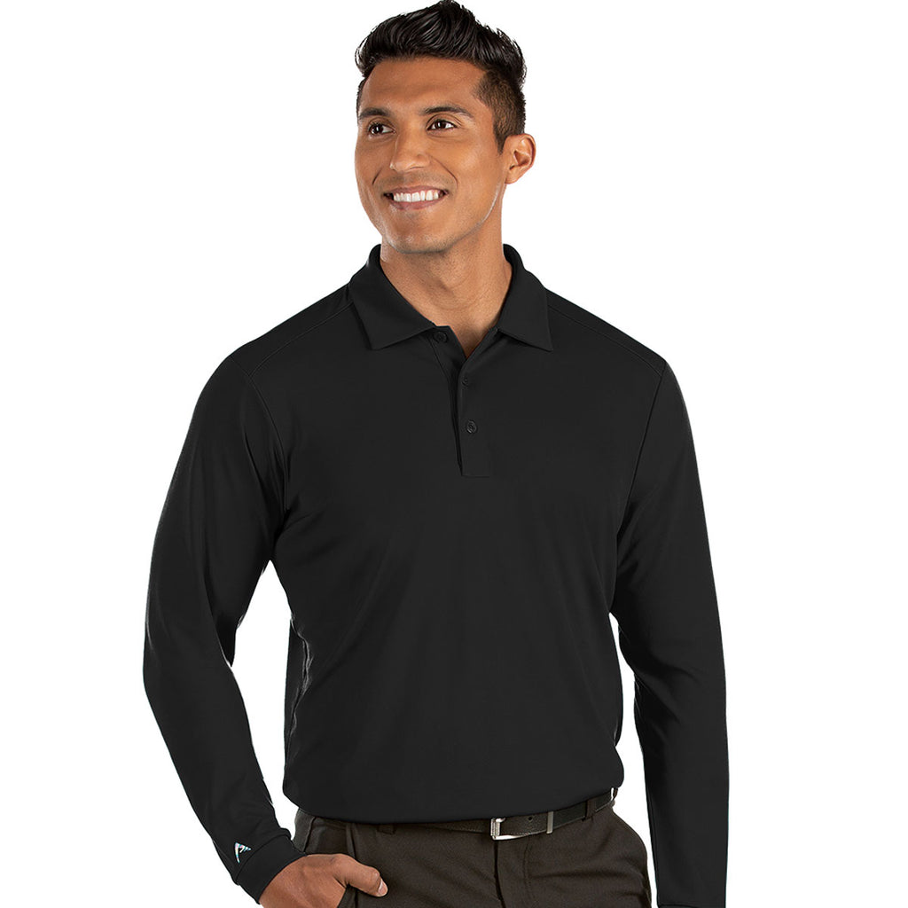 Get active with a custom Antigua Men's Black Tribute Long Sleeve T-Shirt with embroidery. The long sleeve tee is made of 100% polyester with side slits and UPF sun protection of 50+ for those days when there is a chill in the air, yet the sun is shining bright. The sleek look of this long sleeve tee is ideal for golf events, as client gifts, or as employee gifts with a company logo. Add a custom logo to add to your logoed apparel line and watch as these fly off shelves. Available in a variety of sizes to fit your needs, so place your order today.Corresponding Women's Style:Antigua Women's Black Tribute Long Sleeve T-Shirt