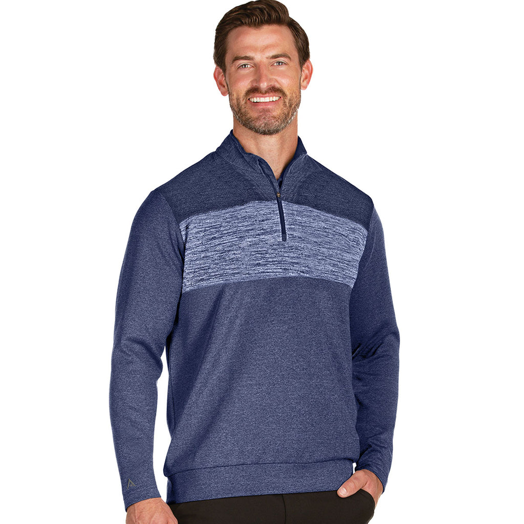Step up your look with a custom Antigua Men's Moody Heather Multi Odyssey Quarter Zip Up with contrasting chest panel for a high-end look that keeps things comfortable all day long. The polyester spandex blend offers a bit of stretch so your range of movement is not restricted. Add a company logo to wear during executive golf events or on days off as you relax and unwind. Great as employee gifts for any occasion or to use as part of a uniform for those who do deliveries or work directly with clients. The simple design of this 1/4 zip does not take away from its overall style. Place your order today.Highlights