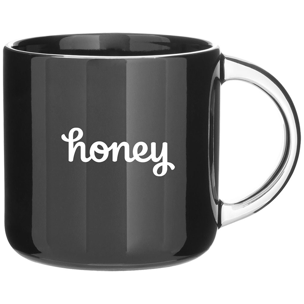 - 14 oz stoneware: glossy color out / glossy color in with metallic rim and handle