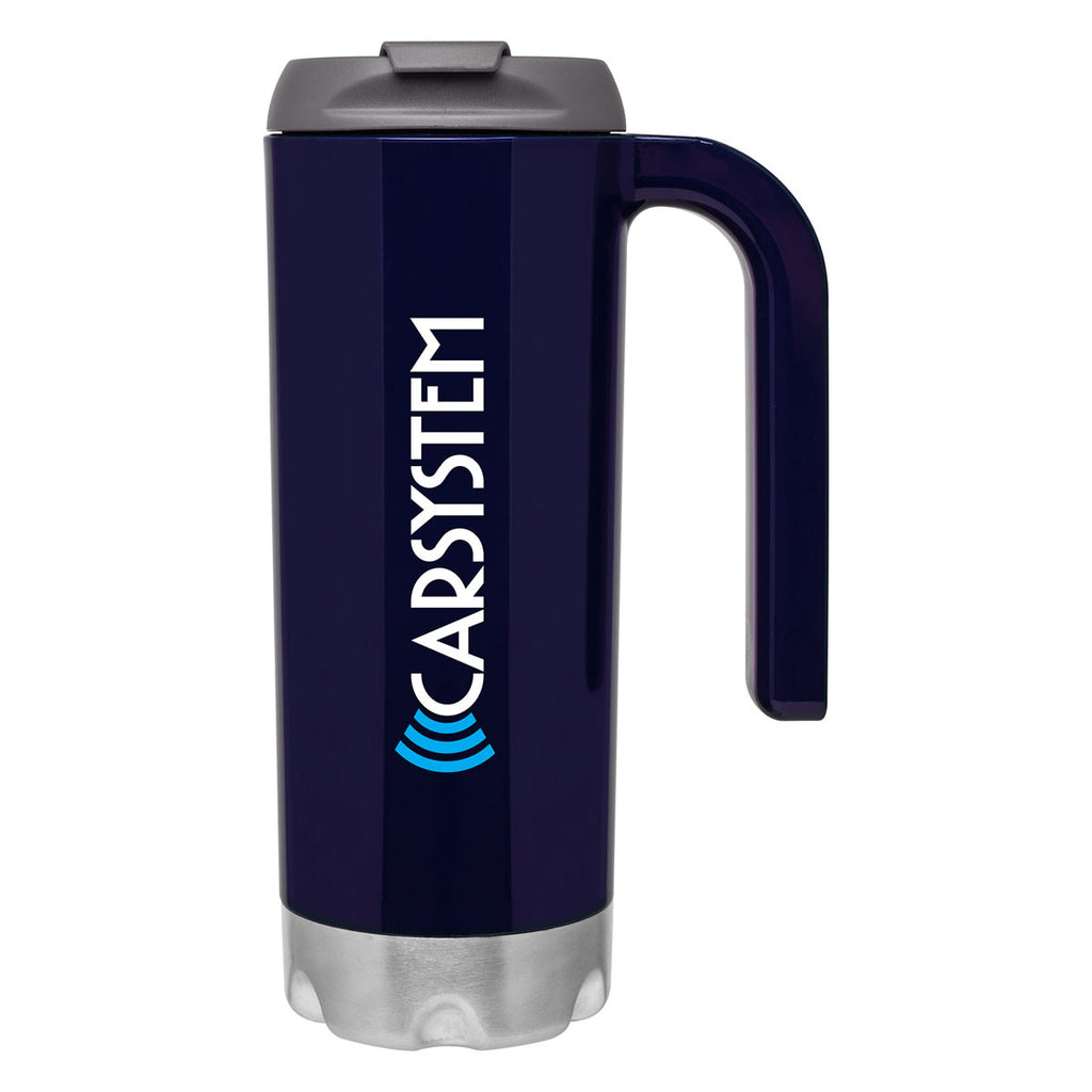 Promote your brand with this faceted double wall acrylic mug that keeps beverages piping hot. It has a steel base and snap-fit threaded lid to make on-the-go usage convenient. This ETS Navy Blue Atlas Acrylic Stainless Steel Mug 16.9 oz with an ergonomic handle helps you get your brand out to the world.