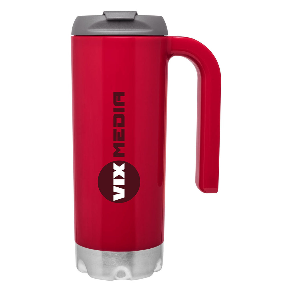 Promote your brand with this faceted double wall acrylic mug that keeps beverages piping hot. It has a steel base and snap-fit threaded lid to make on-the-go usage convenient. This ETS Red Atlas Acrylic Stainless Steel Mug 16.9 oz with an ergonomic handle helps you get your brand out to the world.