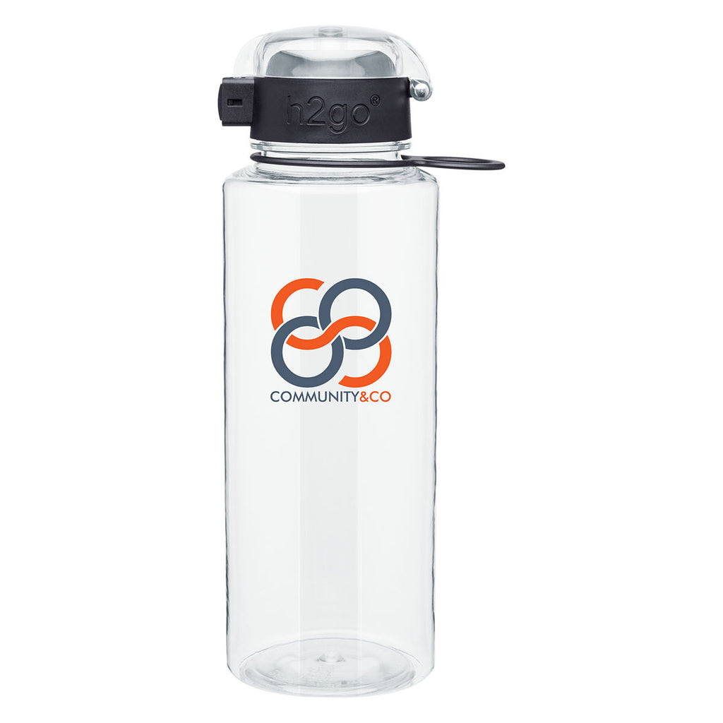 Perfect for the fitness gurus and daily commuters, this H2Go Clear Pismo Bottle 28 oz is stylish, functional, and BPA-free hydration container. It holds up to 28-oz and features one-touch push-button flip lid and carrying loop. Personalize it with your company logo or custom design for an impactful corporate engagement.