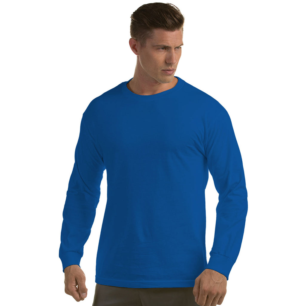 At the next corporate golf event, give away the printed Antigua Men's Royal Long Sleeve Crew Tee to leave a favorable impression on every golfer that attends. Make sure to add your company logo on the large imprint area to turn the favorable impression into an effective marketing tool. One-hundred percent preshrunk cotton fabric delivers supreme comfort, and also withstands the punishment delivered by an active lifestyle. Wear the long sleeve crew tee as the first layer for a chilly morning and as the only layer later in the day when the temperature starts to climb. With your logo attached, this long sleeve tee turns into an affordable giveaway item everyone that receives it is sure to love.Highlights
