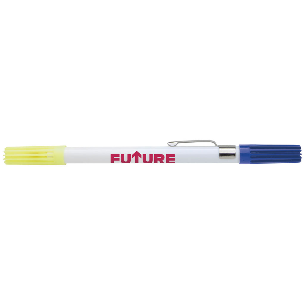 The custom logo DriMark White/Blue Double Header Highlighter Ball Pen Combo is an ideal promo product to buy in bulk quantity. You can have your company name screen printed onto the item and hand it out at upcoming trade shows and recruiting events.