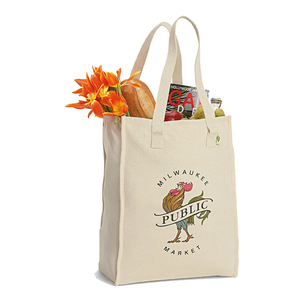 Create a custom look with the Gemline Natural Recycled Cotton Market Bag. This bag was made for a weekend trip to the Farmer's Market. Made of recycled materials so you can stay green while buying local or taking a snack to an outdoor event. The beautiful cotton material is easy to clean while remaining durable. Place an order today.
