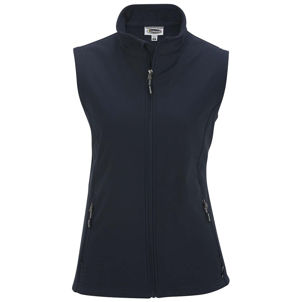 Stay protected when the weather starts to turn in a custom embroidered Edwards Women's Navy Soft Shell Vest in three color options. Add a company logo or team name to these polyester rich spandex vests with microfleece inner layer for warmth. The lightweight vest offers 3 layer bonded fabric for both protection and versatility. Add your corporate embroidery to use these as part of employee apparel or as part of hospitality apparel for those who need to be outdoors, such as valets or attendants. The zippered front has zippered pockets and a full length wind guard. Easy to machine wash for repetitive wear.Highlights