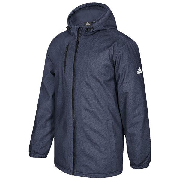 adidas Men's Navy Game Built Heavyweight Jackets with custom embroidery will keep you warm and looking great whether on the slopes or battling harsh conditions at the next athletic related event. Made of 100% polyester twill body with dyed to match polyester tricot lining this jacket is a showstopper. Add a company logo to the jacket and use as part of employee apparel for those who have to be out in the elements or just to wear on your commute. These make welcomed corporate gifts with a bungee cordlock hood, padded, snap close front pockets, and a hidden zipper pocket in the inner lining. Place your order today to have these beauties on hand for the next event.